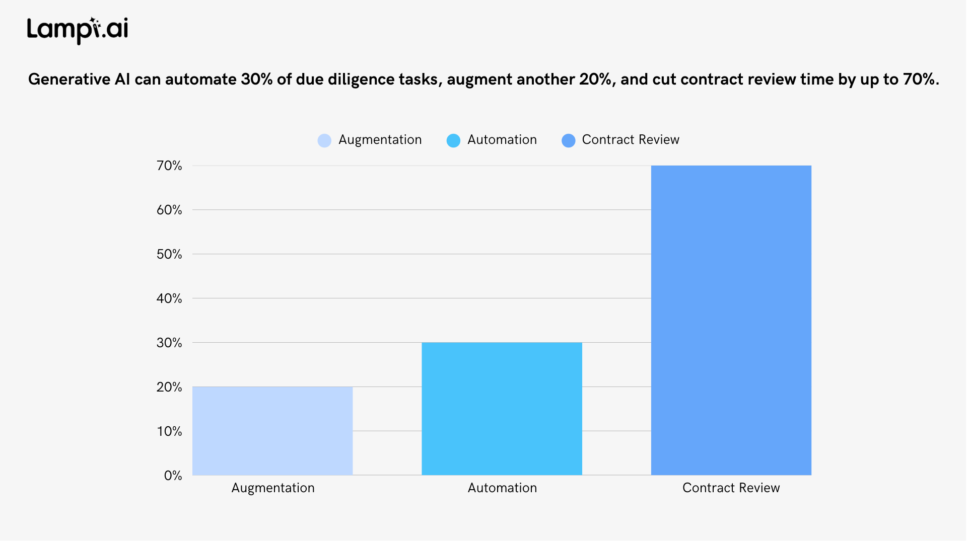 Industry research suggests 30% of diligence tasks can be fully automated and another 20% augmented by generative AI.