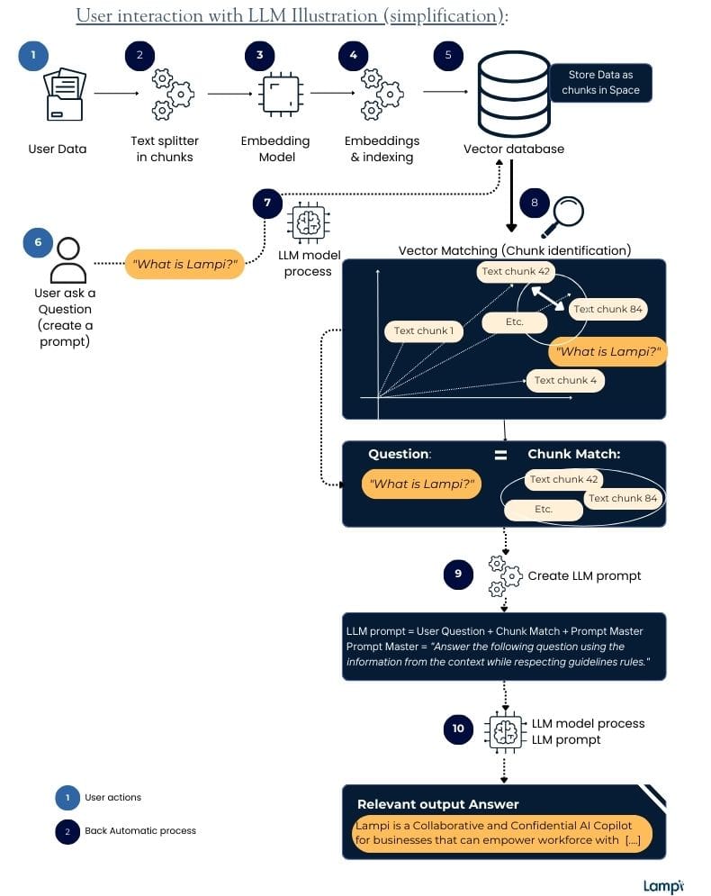 - Prompt: When a user asks a question, it's also converted into a vector in a similar manner to the text chunks. This ensures that the question can be accurately compared to the existing database of chunk descriptors. The conversion allows the AI to perform an accurate 'semantic search' by comparing the vector of the asked question to the vectors of pre-existing text chunks. The system (when it is well-designed) identifies and retrieves text chunks that are most closely related to the asked question.